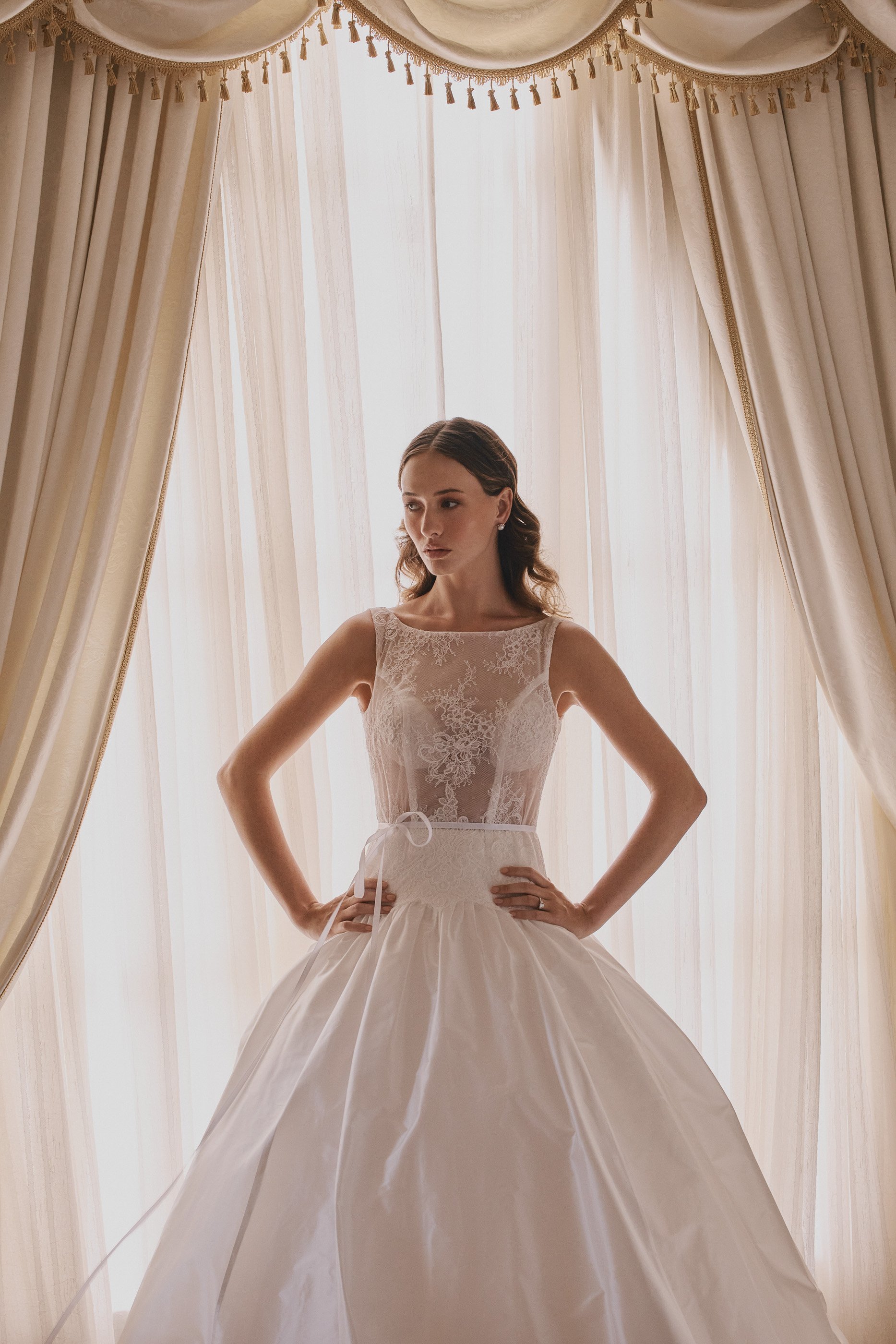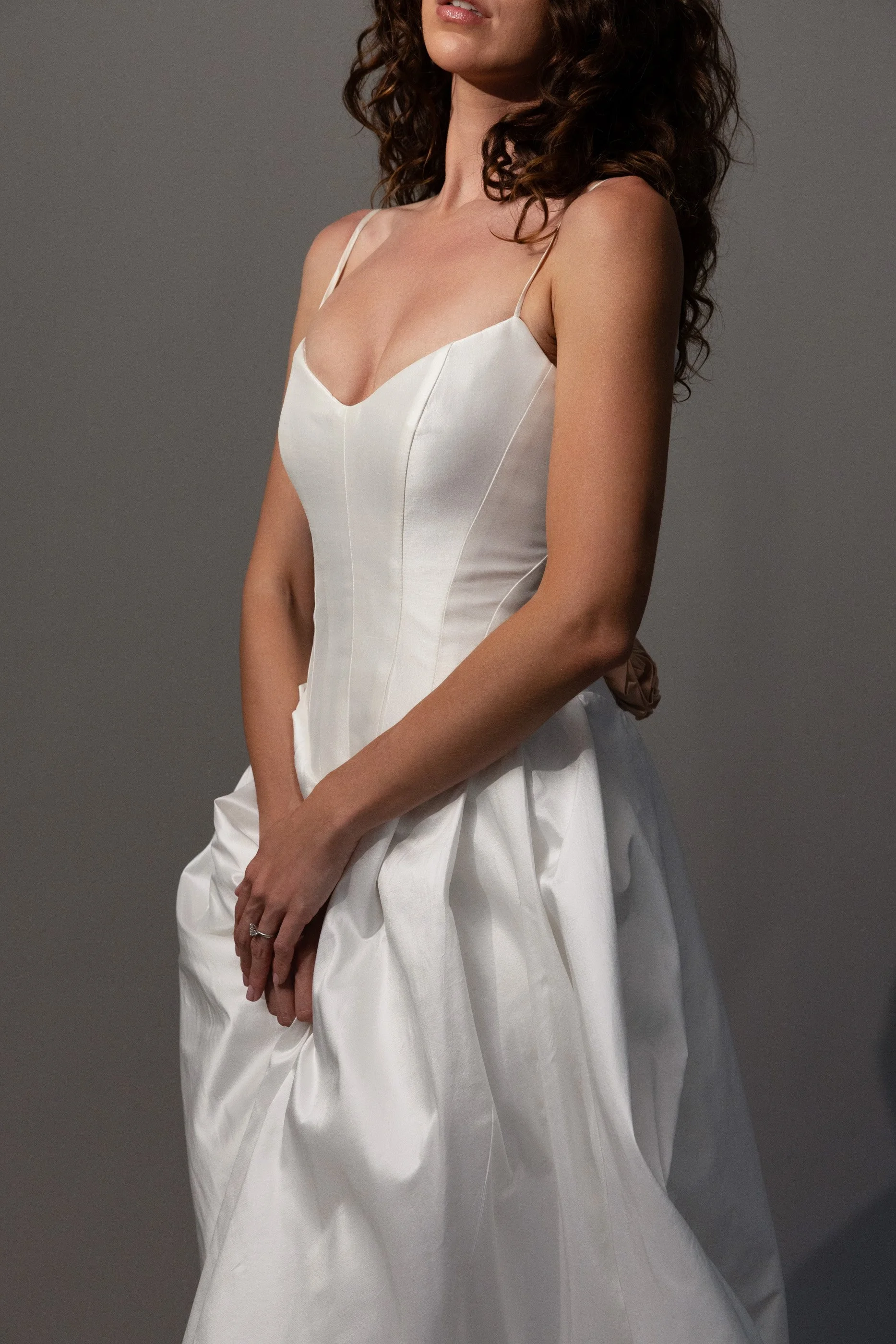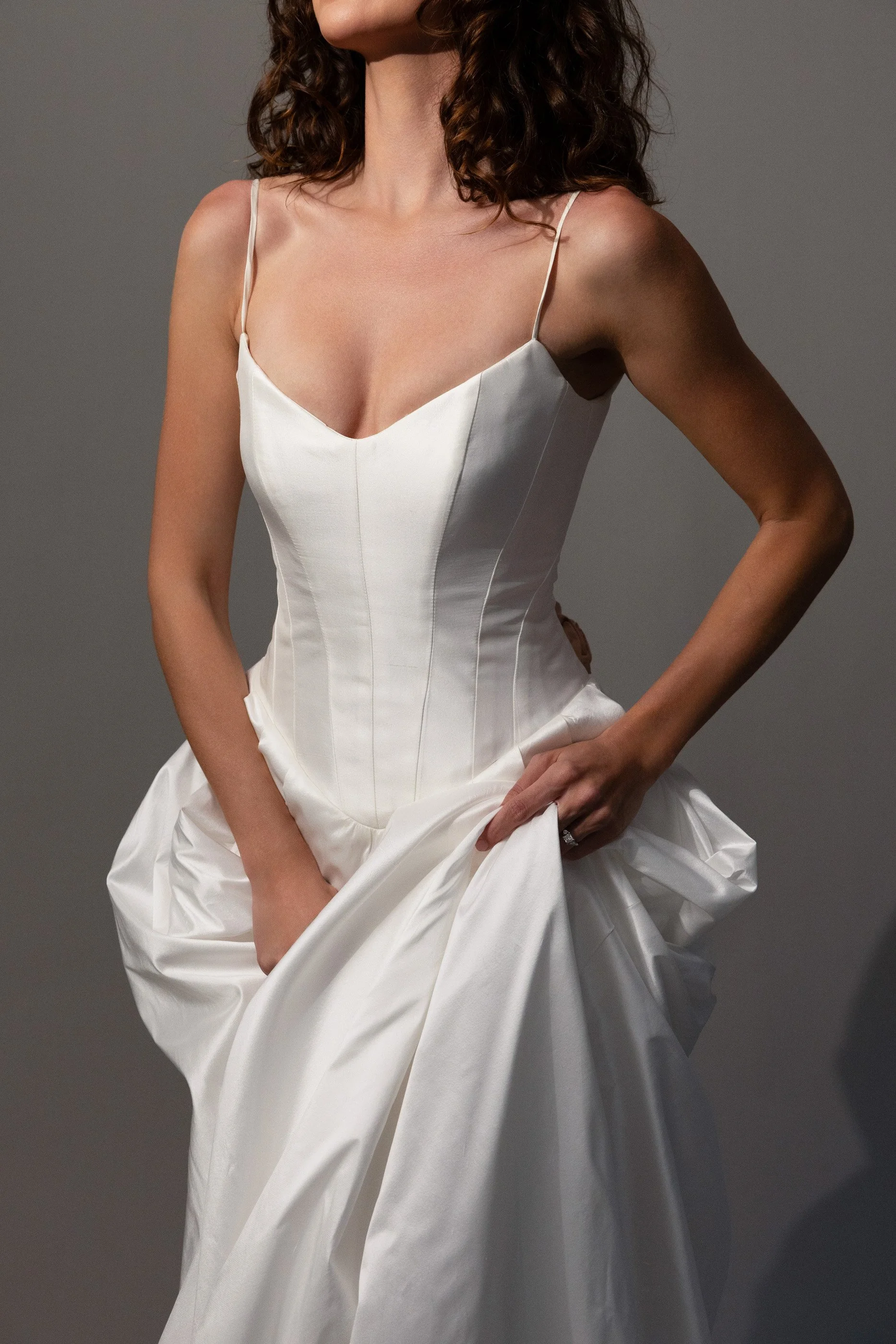 Crisp silk. Luminous brocade. Sculptural corsetry shaped to move with the body. Cascading bias cuts and playful hemlines introduce softness and individuality.