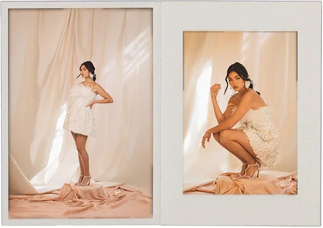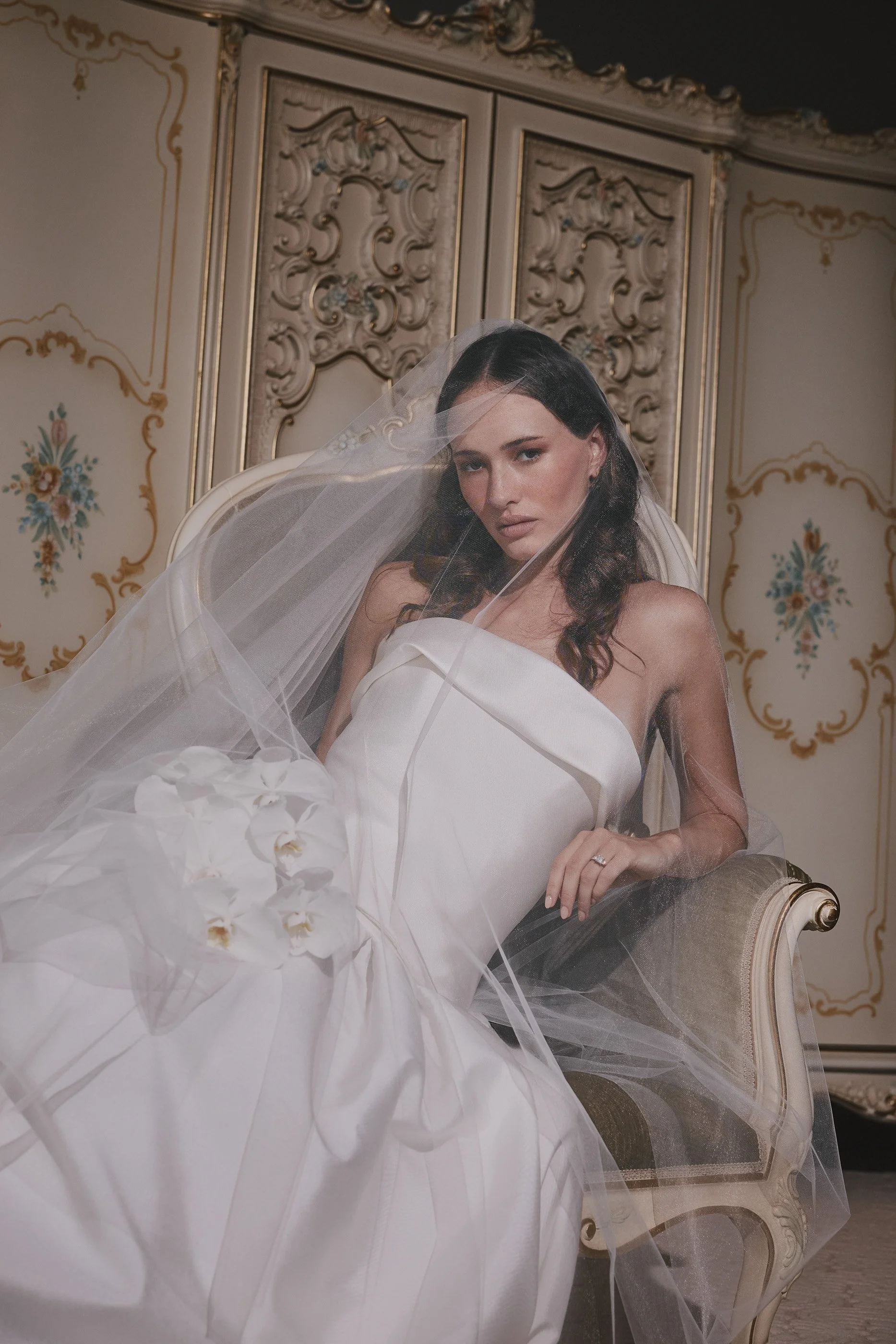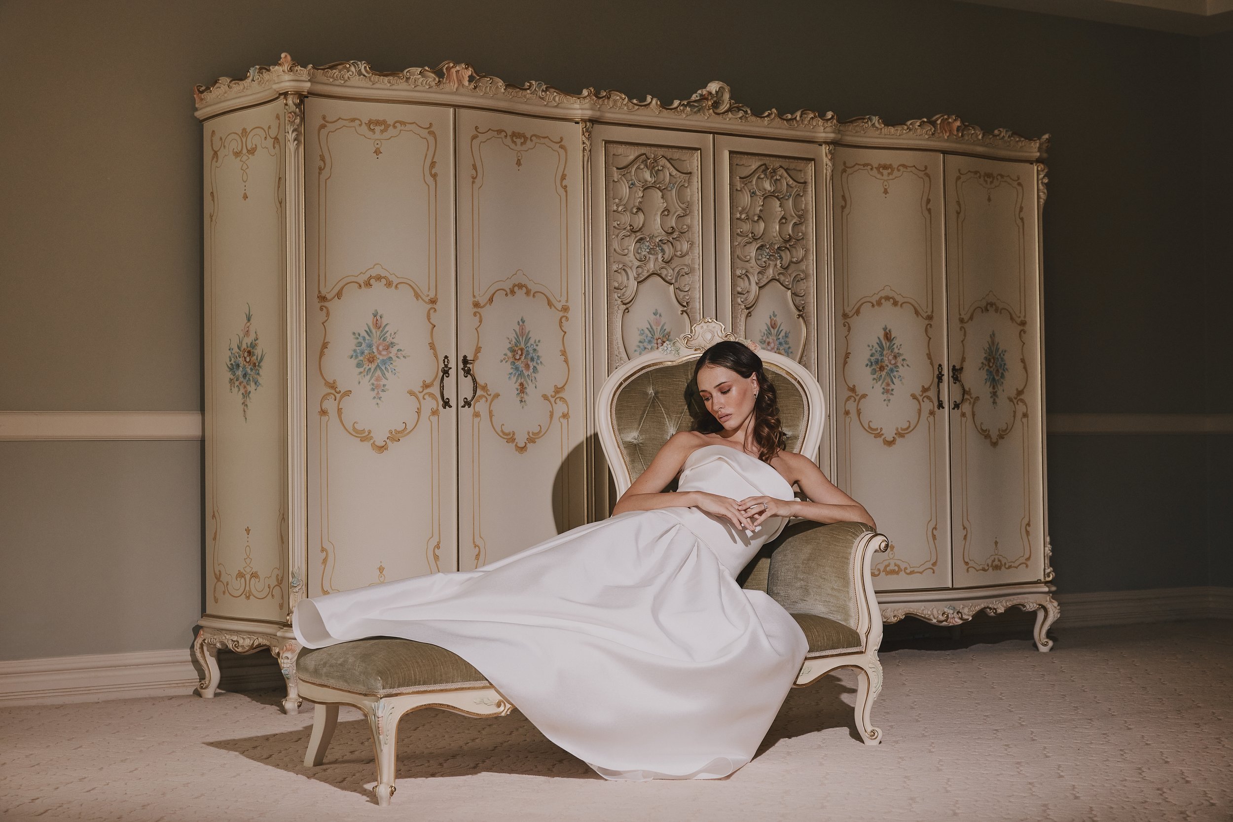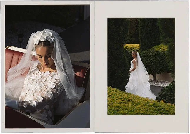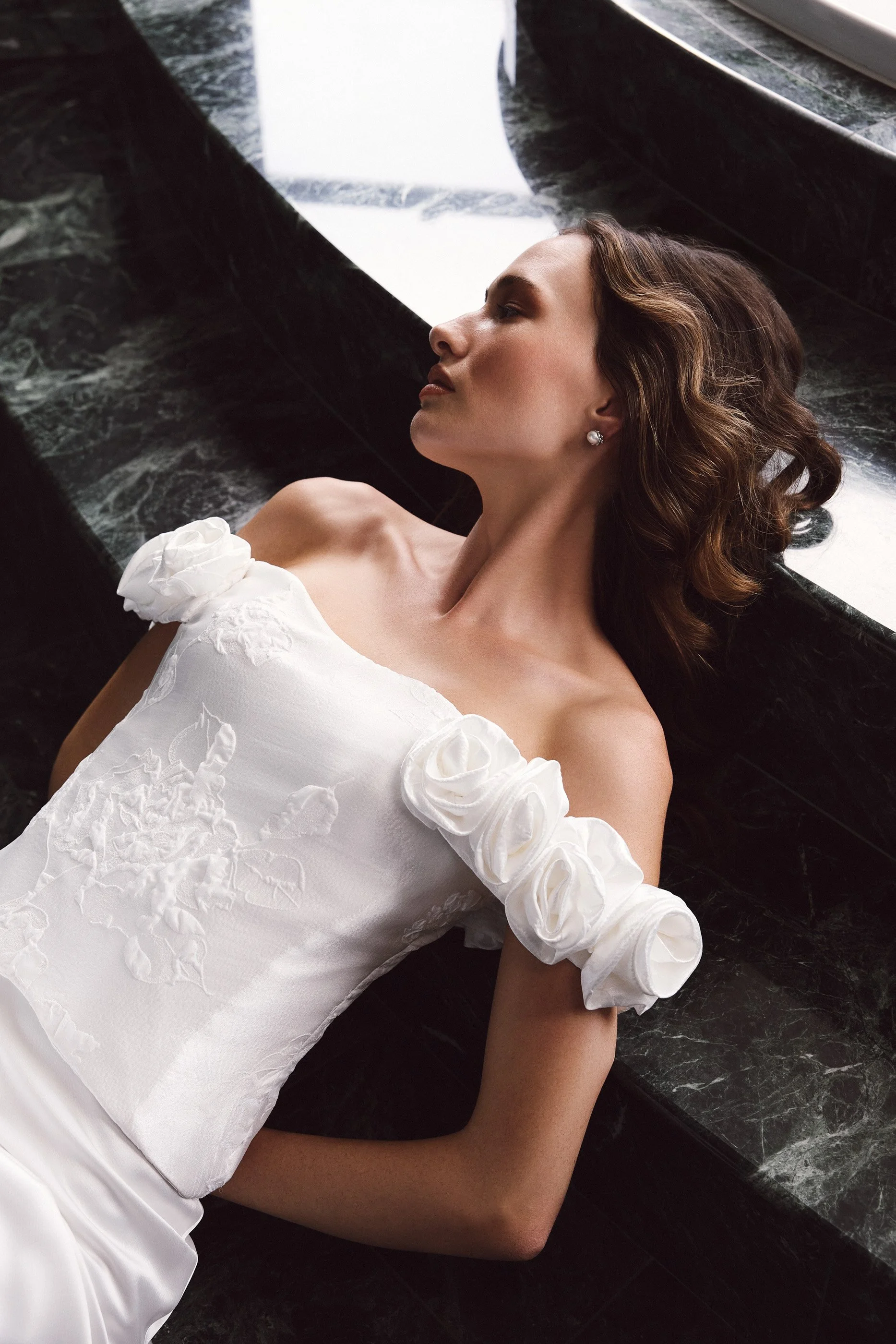 Crisp silk. Luminous brocade. Sculptural corsetry shaped to move with the body. Cascading bias cuts and playful hemlines introduce softness and individuality.