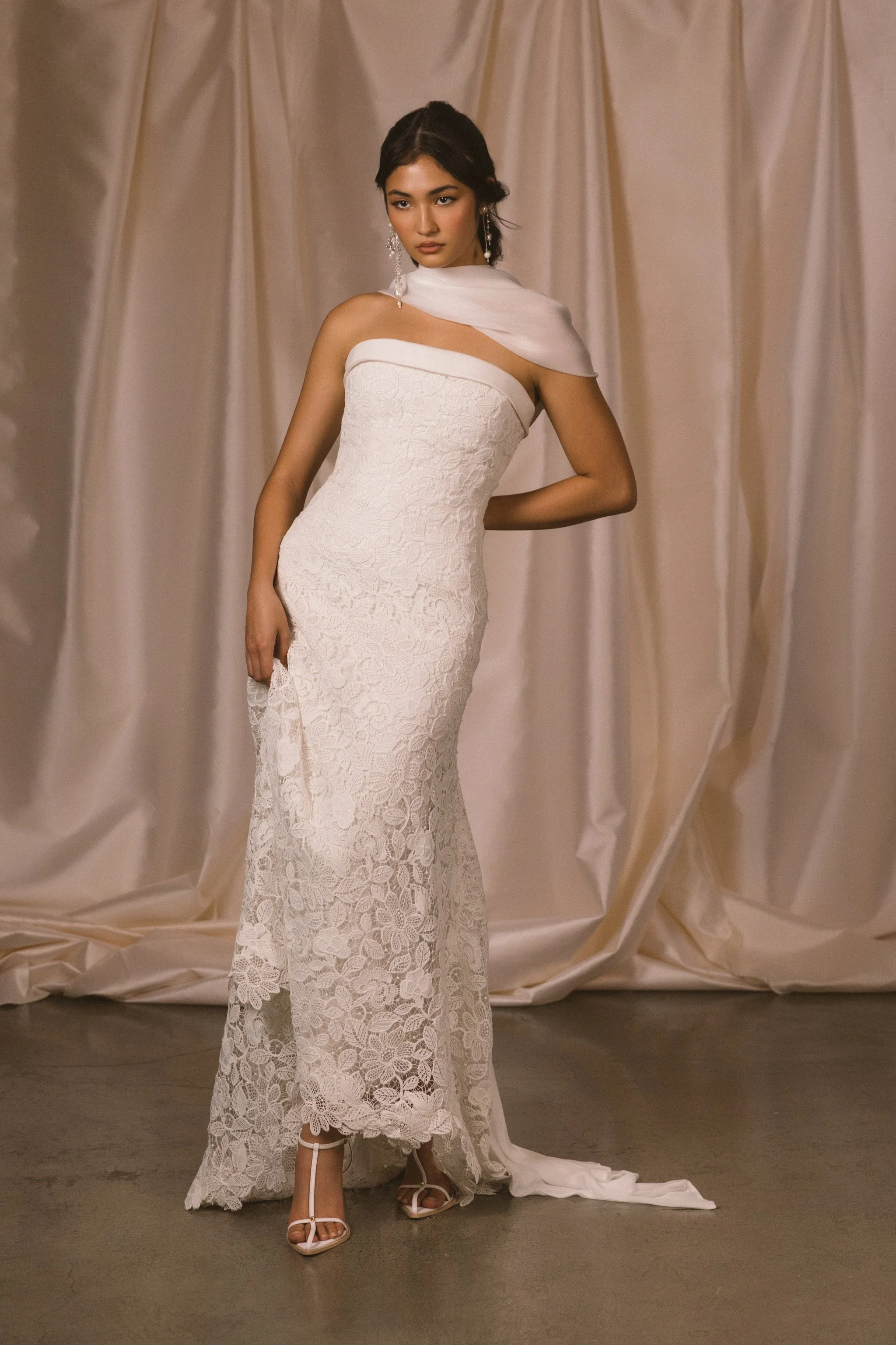 The effortless elegance of the Olivia gown is unparalleled. Designed for the understated bride, this gown is crafted from ornate guipure lace, fusing timeless nostalgia with modern desires. The drop waist creates seamless lines, ensuring a true skin fit to the body.